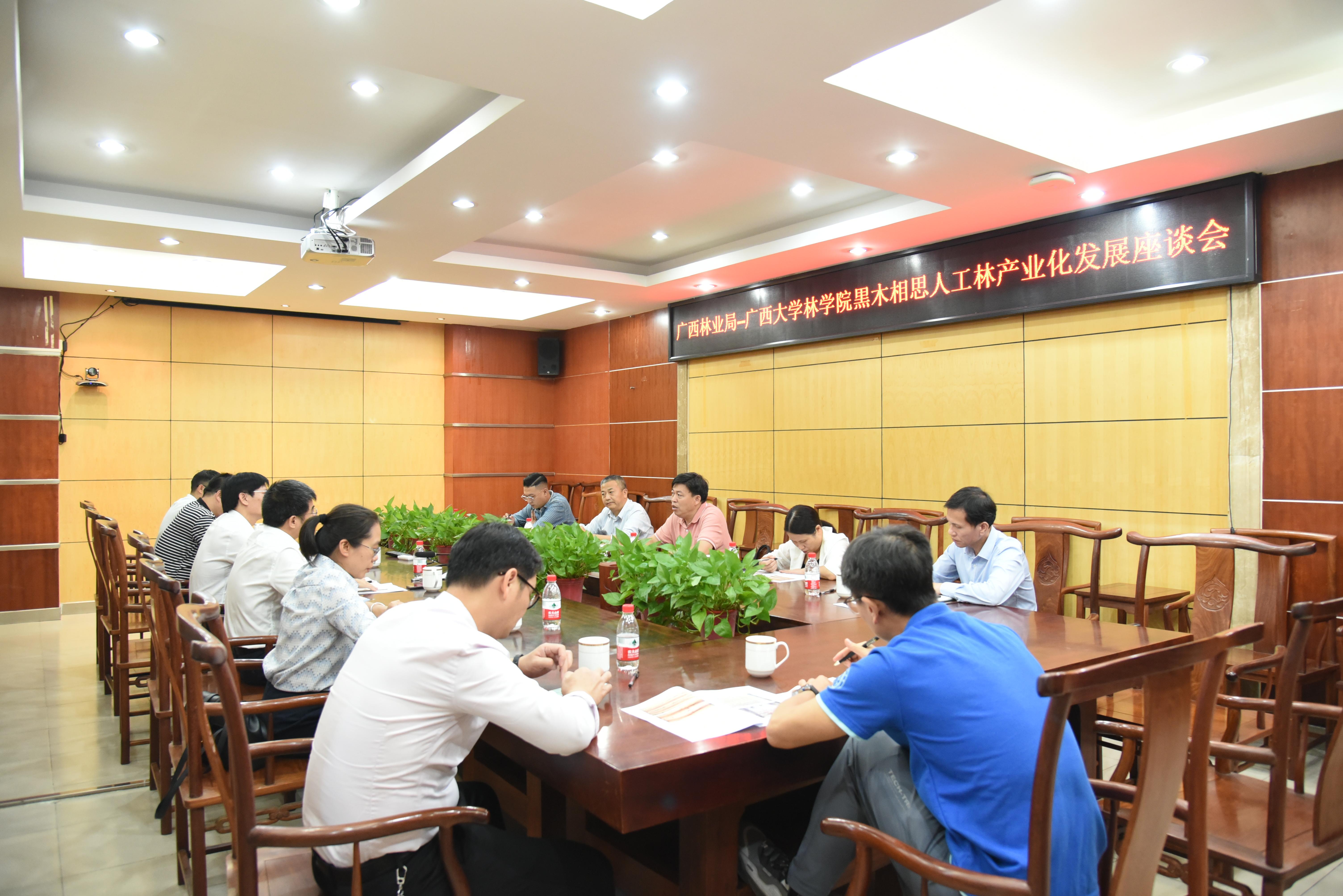 11月10日,广西壮族自治区林业局林场种苗处处长樊吉尤一行5人到我院调研指导黑木相思人工林产业化发展。院党委书记符韵林、常务副院长叶绍明、党委副书记徐丽、副院长梁俊波及黑木相思课题组老师参加调研活动。
