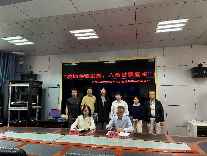 当天下午,在八角乡人民政府会议室举行党建共建框架协议签订仪式。八角乡党委书记梁政扬与我院林学系教工党支部书记蒋维昕代表双方,签署《中共八角乡委员会与广西大学林学院林学系教工党支部共建框架协议》。协议明确,未来三年双方将以党建为引领,围绕组织共建、党员共育、技术共研、产业共兴深化合作,建立常态化沟通机制,持续为八角产业高质量发展提供技术支撑与人才保障。