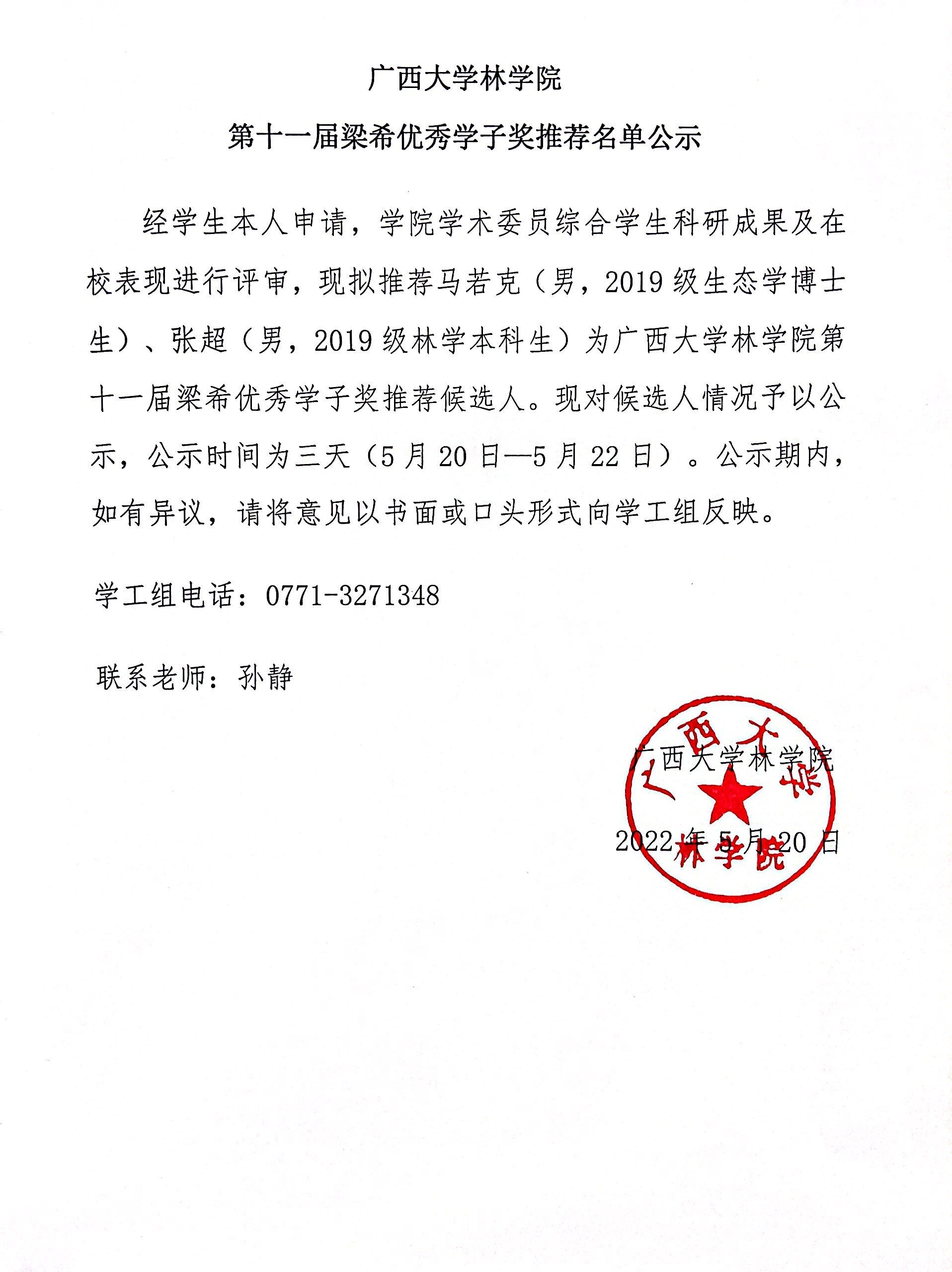 广西大学林学院第十一届梁希优秀学子奖推荐名单公示