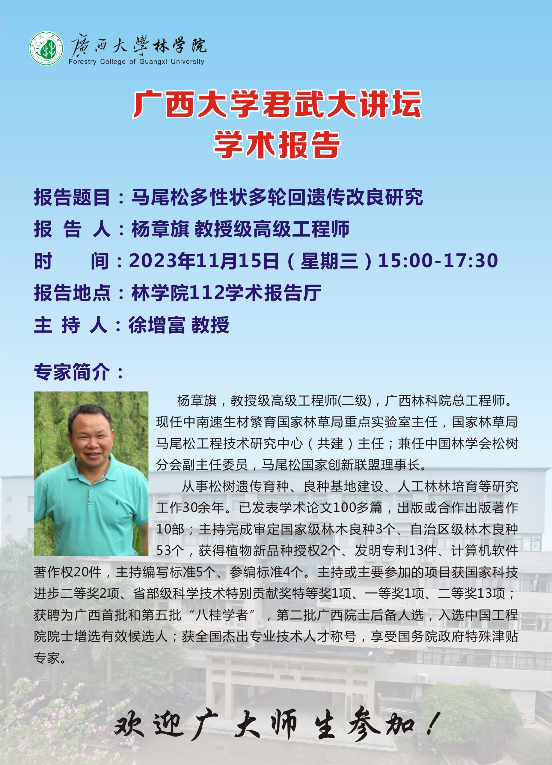 学术报告:马尾松多性状多轮回遗传改良研究