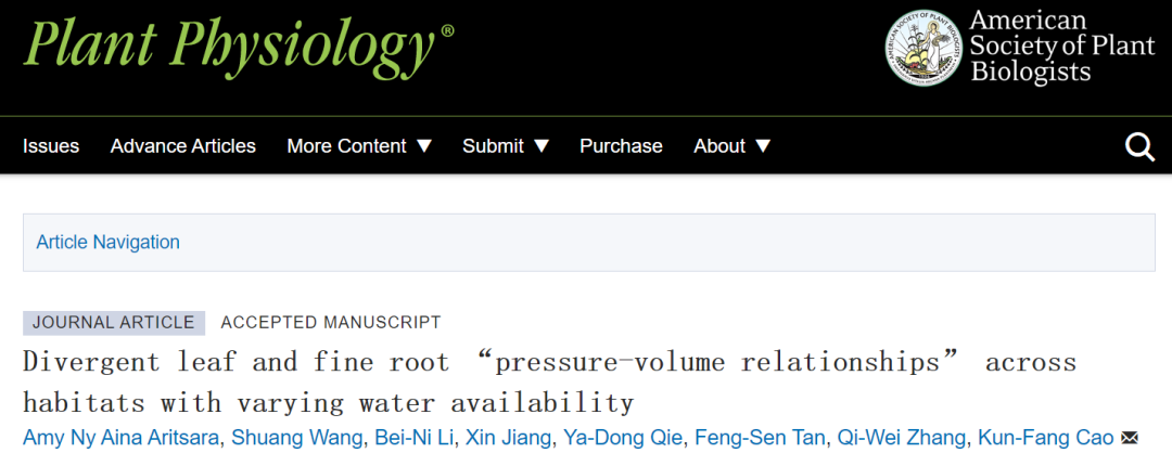 近日,广西大学“亚热带农业资源保护与利用国家重点实验室”植物生理生态与进化课题组曹坤芳教授团队在Plant Physiology发表了题为Divergent leaf and fine root“pressure-volume relationships”across habitats with varying water availability的研究论文,揭示了不同生境木本植物水力“熔断”机制。