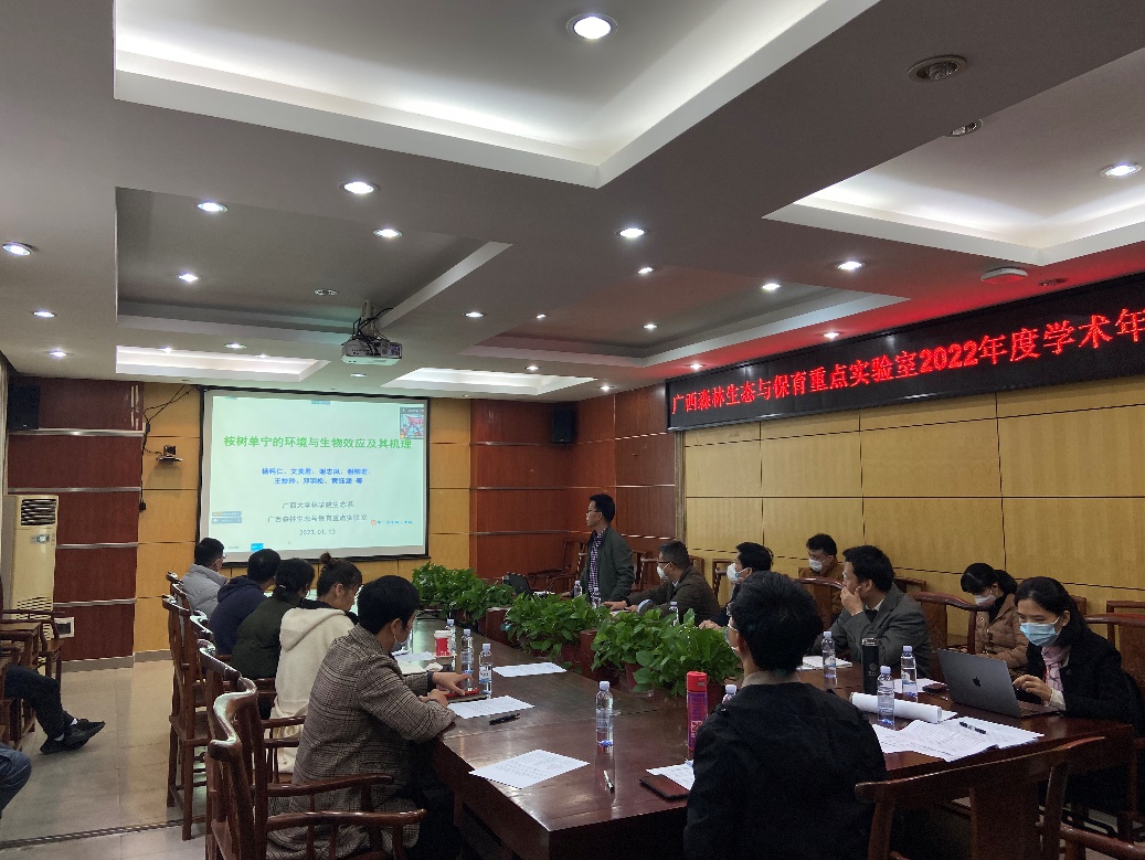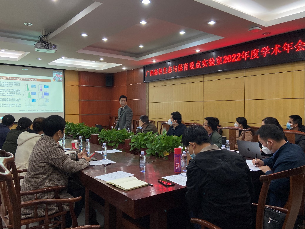 会议主要分为三个流程,首先,由重点实验室主任申卫军教授作2022年度工作总结与下一年度的工作设想报告。申卫军教授围绕过去一年获得的成果、实验室发展现状及下一年工作思路三个方面作了详细介绍,并提出以“立足广西,培养适应现代林业与生态文明高质量发展的复合型人才”为目标,努力在下一年工作中优化科研团队与加强实验室的成果转化,争取在学术方面获得更高的突破。