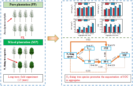 桉树是中国主要速生丰产树种之一,其因适应性广、抗逆性强、生长迅速等特点被广泛种植,产生了巨大的经济效益,但由于各种不合理的经营措施导致诸多生态问题不断突显。鉴于此,我院研究团队以15年生桉树纯林(PP)和桉树/马占相思(固氮树种)混交林(MP)为研究对象,采用酸解法重点探究引入固氮树种对桉树人工林土壤团聚体有机碳组分积累和转化的影响,并分析了其驱动机制。