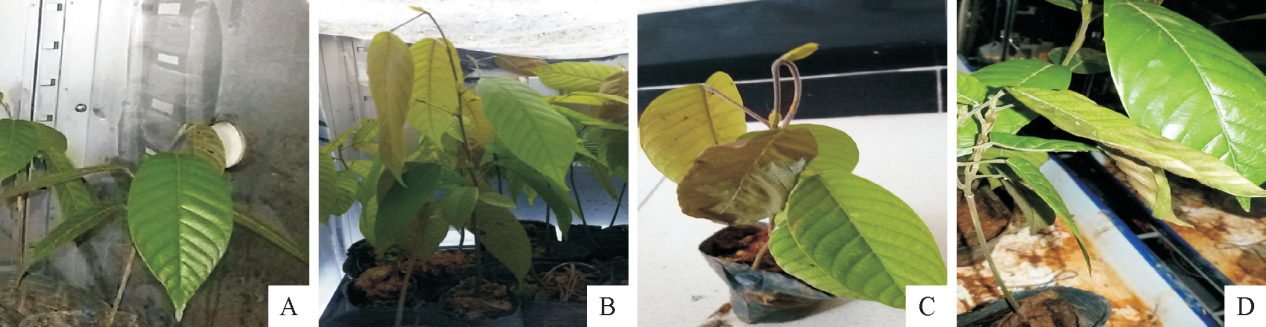 注:A.低温0℃处理0d后植株叶片症状;B.低温0℃处理1d后植株叶片症状;C.低温0℃处理2d后植株叶片症状;D.温度回升到25℃后植株叶片症状。