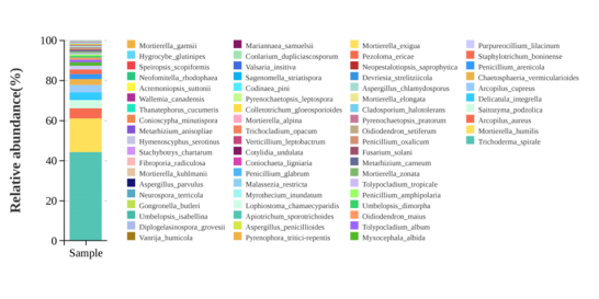 我院符韵林教授研究团队为寻找高效生产高质量沉香的菌种,采用野生沉香提取内含真菌制成真菌诱导剂,进行高通量测序,分析其物种组成(图1),并利用FUNGuild对其进行功能预测。结果表示,在种水平上获得67个种,其中13个优势种的相对丰度之和为91.26%,其中Trichoderma spiraleBissett为最优势种,相对丰度为44.10%。另外,真菌的营养类型以腐生-共生营养型(19.46%)的相对丰度最高;以植物内生菌-凋落物腐生菌-土壤腐生菌-未定义腐生菌为真菌功能的优势类群。从真菌代谢物对沉香树的影响推测Mortierella humilisLinnem. ex W.Gams、Oidiodendron maius(Barron)和Tolypocladium album(W. Gams) Quandt, Kepler & Spatafora是促进结香的新菌种,为沉香树结香菌种的筛选提供理论基础,对未来探索出最适于白木香结香的真菌菌种组合有重要的借鉴作用。