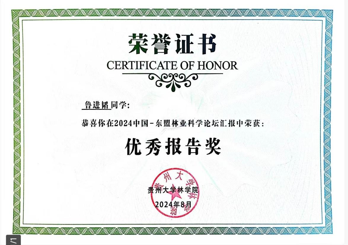 我院博士研究生鲁进韬受邀参加2024年“中国-东盟林业科学论坛”学术交流活动,以“桉蝙蛾幼虫肠道微生物与寄主取食偏好的相关性(The Correlation between the Gut Microbiota ofEndoclita signifer(Lepidoptera, Hepialidae) Larvae and Their Host Preferences)”论文为主题进行学术报告,与参会人员开展了深入交流与讨论,并在报告评比中获得“优秀报告奖”。