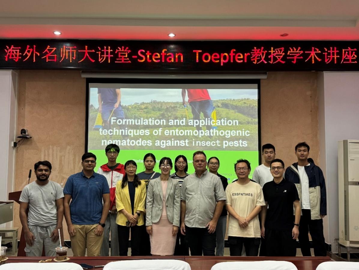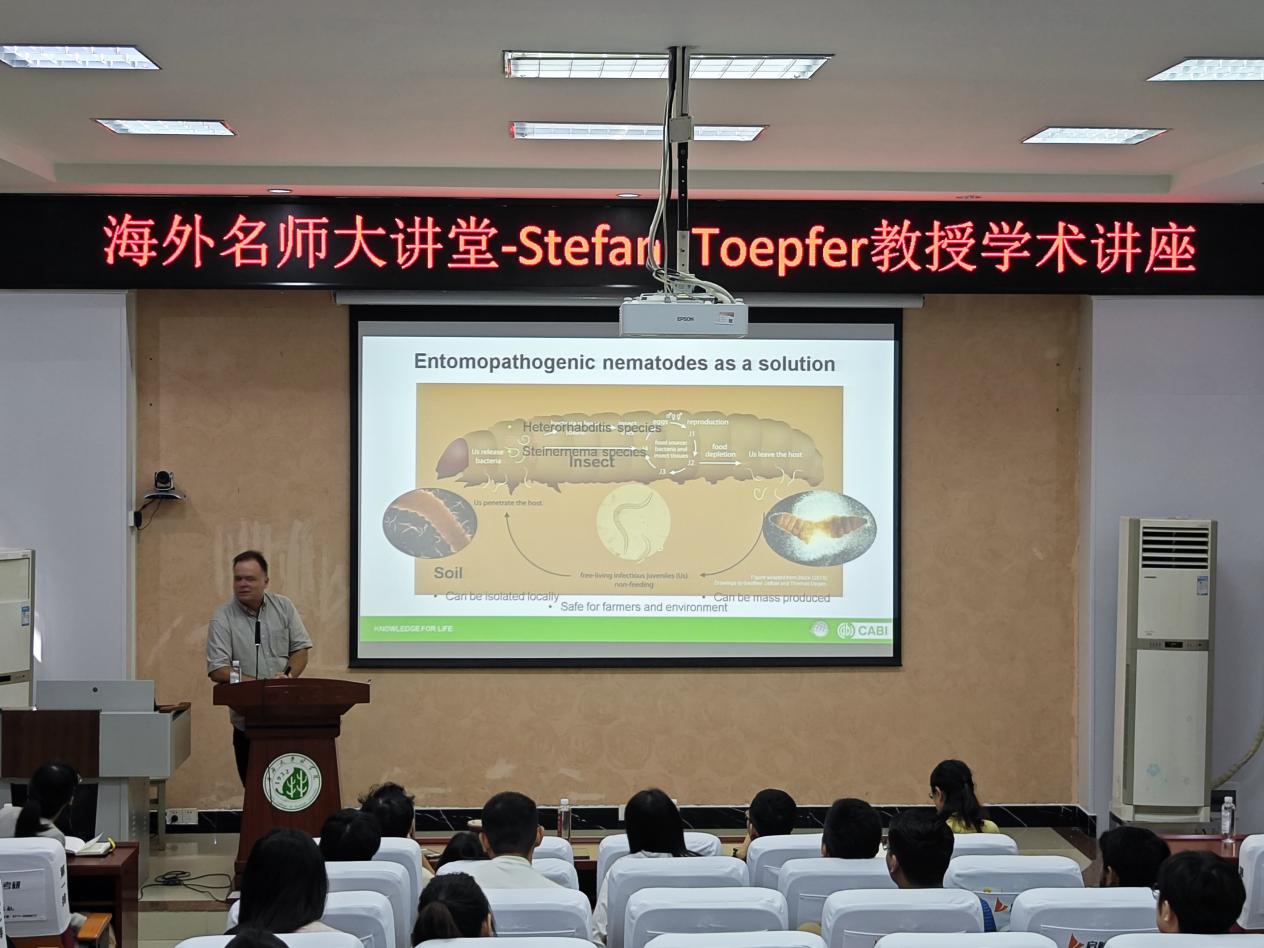 2024年10月25日上午,来自CABI(Commonwealth Agricultural Bureaux International)瑞士-匈牙利中心的世界著名植物保护专家Stefan Toepfer教授受邀做客“广西大学海外名师大讲堂”,作“昆虫病原线虫对抗入侵性害虫的配方与应用技术”(Formulation and application techniques of entomopathogenic nematodes against invasive insect pests)学术报告。本次报告会在林学院112会议室举行,林学院院长助理、森林保护领域青年学者胡平副教授主持报告会,农学院吴海燕教授及其团队成员、农学院植保学科的部分研究生、林学院研究生及森保团队师生100余人参加会议。