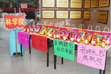 活动中,学院领导老师将精心准备的“暖心礼包”送到考研学生手中,代表学院向积极备考的学子表示关心和慰问,鼓励大家在备考最后冲刺阶段一定要发扬敢于拼博,敢于胜利的精神,全力以赴的实现本自己的考研目标和人生追求。美好寓意的“暖心礼包”,浓缩了学院领导老师以及林院学子们诚挚的祝福,寓意考生们“金榜题名,非你莫属”,祝愿每一位考研学子成功上岸。