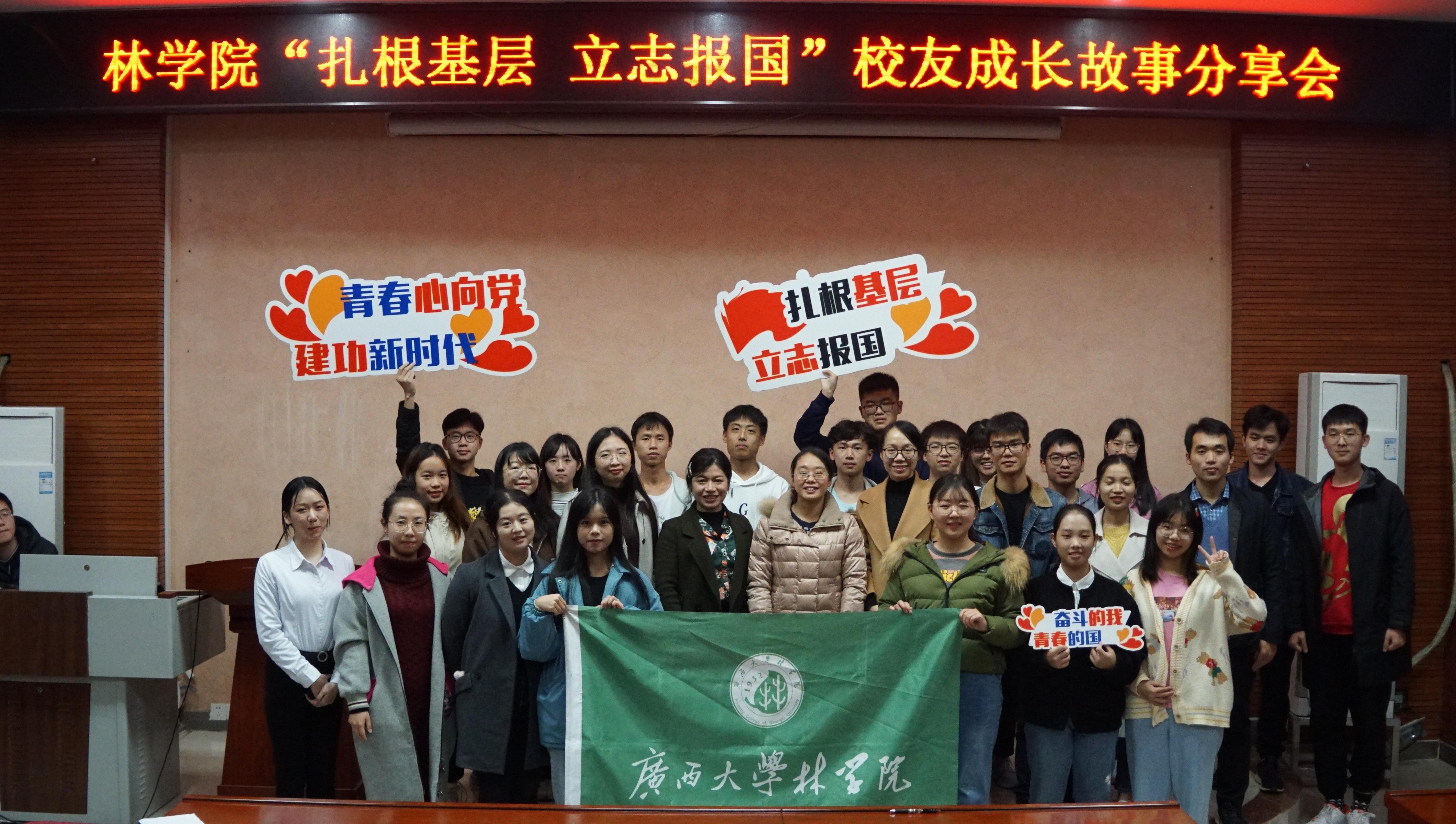 为鼓励林苑学子扎根基层,勇担强林兴林使命,12月26日林学院在学院112教室举办了“扎根基层,立志报国”主题校友成长故事分享会。我院黄超群、周江悦、谭诗蓓、申庆海和黄瑞琛五位扎根基层优秀青年校友作为嘉宾分享成长故事。院党委副书记徐丽、院团委书记银宁、院团委副书记马奕、院辅导员李琼莹、孙静以及学生代表100余人参加分享会。
