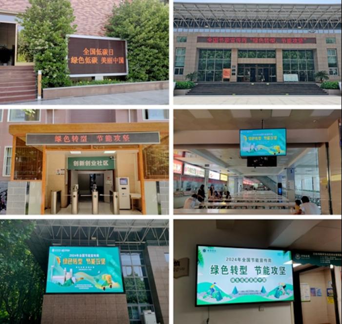 利用学校北大门、1号办公楼、大发学生发展与服务中心、各学生公寓楼等多处的LED电子屏幕,滚动播放节能宣传周主题和低碳日主题;利用璞玉楼餐饮中心、学生公寓楼、大学生发展与服务中心广场的显示屏循环播放节能知识。宣传标语处处可见,充分营造了节能宣传的氛围。