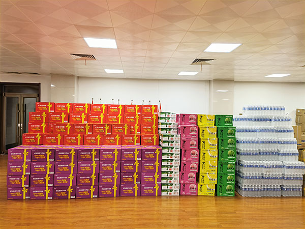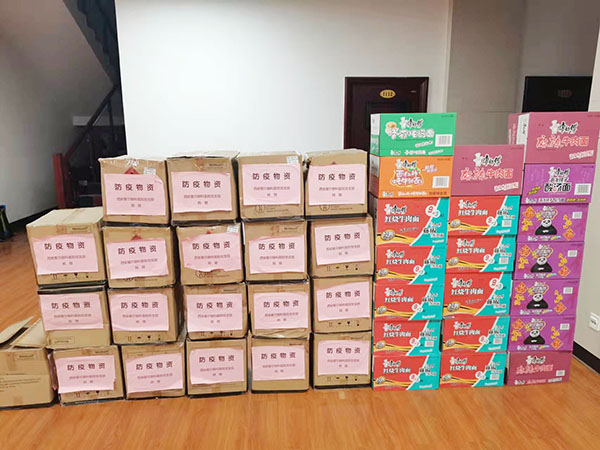 27.陕西梦诏团队向母校捐赠物资:方便桶面200箱2400桶,芒顿小镇100箱1500个,矿泉水80箱1920瓶,牛奶50箱800袋,子洲山地小米200份。