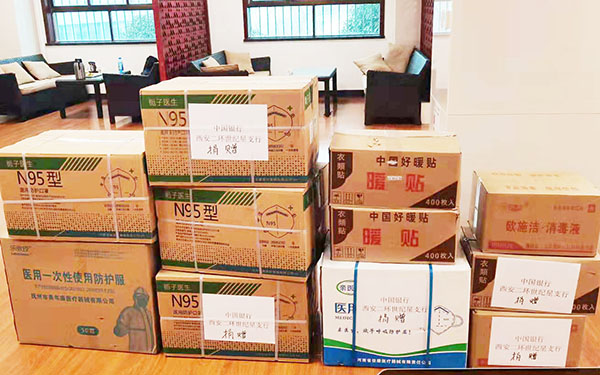 22.中国银行西安二环世纪星支行捐赠物品:N95五箱4800个、暖贴1200(3箱)、消毒液两箱20桶、防护服50套。