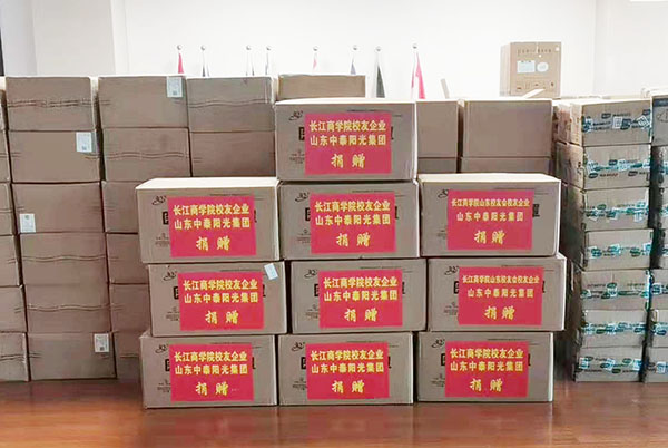 36.长江商学院陕西校友会捐赠明发体育(集团)股份有限公司价值50万元物资:多维牛磺酸片72箱(11520瓶),N95口罩10大箱和100小箱(32000个),橡胶手套1箱(1500双),隔离面罩1箱(130个),一次性医用外科口罩10箱(20000只),护目镜30箱(3000个),防护服1箱(40套),六月鲜酱油礼盒38箱(150个礼盒)。