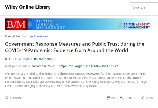 西京网讯:近日,我校会计学院教师、现代审计与绩效管理研究中心和Accountaholics核心科研团队成员Yasir Shahab博士等在British Journal of Management(BJM)发表论文“Government Response Measures and Public Trust during the Covid-19 Pandemic: Evidence From Around the World”(《政府应对新冠肺炎疫情措施和公共信任:来自世界各地的证据》)。