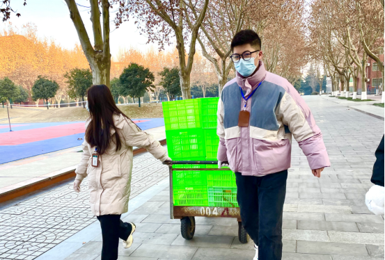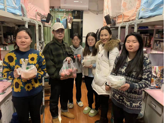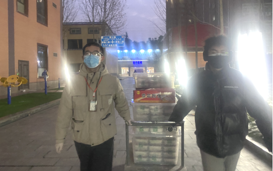 宿舍外的党员志愿者不顾严寒清点食物;宿舍内的同志积极行动起来,帮助老师给各个宿舍分发饭菜。风雪交加的西京,正因为有这些甘于奉献的志愿者,同学们才能及时吃到可口的饭菜,真可谓:“封路、封校、不封心,隔墙、隔楼、不隔爱”