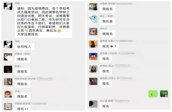 机械研2001班的李攀奇认为:此次活动中我们服务是1号公寓,虽然是封控区,但是我们组10名同学在工作中没有一人抱怨,没有一人打退堂鼓,能为我们的学校和西安的防疫防控尽自己的微博之力,我们感到无上荣光。