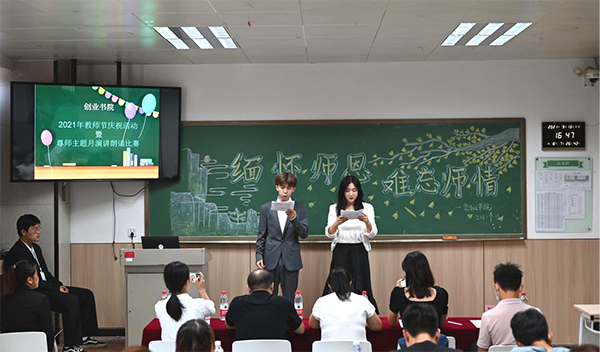 为弘扬尊师重教的传统美德,培养学生学会感恩,増进师生之间的情感,营造和谐的校园氛围,发动学生表达出对老师的浓浓情谊,以实际行动向老师致敬,9月13日创业书院在2116成功举办了“缅怀师恩,难忘师情” 朗诵比赛,邀请了李彦坤老师、李东明老师、陈福利老师、刘艳老师和邓燕芳老师担任评委。