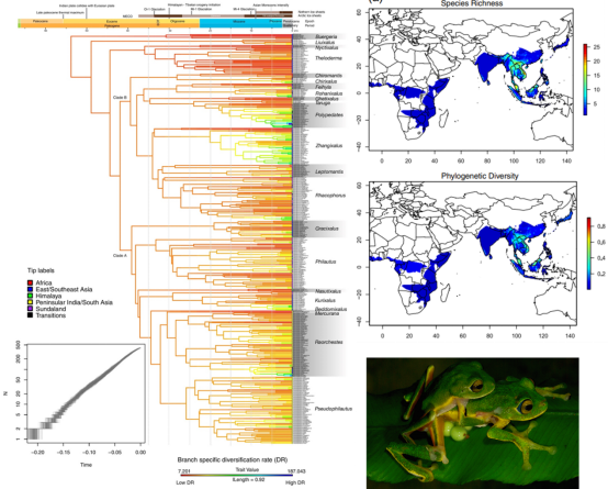 该研究使用最新的数据分析方法,对东半球树蛙科415个物种现有的全部基因组和多基因序列数据进行分类归并,构建生成了迄今为止最为全面的系统发育树(图一)。结果表明,在东半球树蛙科整个系统发育过程中,物种分化速率几乎是恒定的,但物种丰富度的分布却很不均匀、在演化过程中有明显聚集现象。其中,岛屿上的高海拔地区和一些具有阴冷潮湿气候的大陆地区呈现较高的物种多样性和独特的分类群。